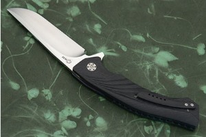 The drop blade is formed from N690 stainless steel, a super-steel created by Bohler in Austria. It takes an incredibly sharp edge and holds on to it. Increased toughness gives it better resistance to edge chipping. The blade is hollow ground for an easy to maintain edge. 3D textured carbon fiber provides a sure, comfortable grip. Titanium liners and a carbon fiber backbar keep the knife light and fast. It is easy to keep this handmade folder close at hand with the machined carbon fiber pocket clip mounted for tip-up carry -- an incredible feature! Excellent fit and finish throughout!