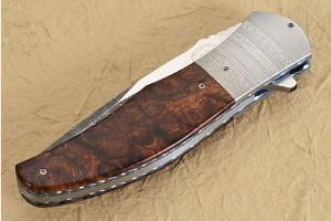 Warm toned presentation grade desert ironwood forms a nice contrast to the hand textured stainless steel bolsters. Blue anodized, fileworked titanium liners surround the stainless steel back spacer.