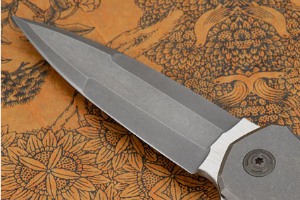Two thick slabs of titanium with dark acid washed finishes and bead blasted fixtures create the ergonomic handle, one forming a solid frame-lock. Includes a tip-up carry clip.