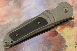 Two thick slabs of stonewashed titanium and anodized titanium fixtures create the ergonomic handle, one forming a solid frame-lock. Textured black G10 was inlaid in the handle for a solid grip. Includes a titanium pocket clip mounted for right-side, tip-up carry.