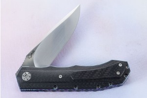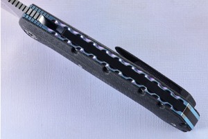 The scales are formed from 3D carved black carbon fiber. The domed carving provides a comfortable, secure grip. Jimping on the thumb ramp aids grip. The flipper doubles as a front guard that keeps the hand from sliding forward onto the blade. The gently rounded handle feels sturdy and fills out the hand perfectly. The handle is completed with blue anodized titanium liners that elegantly contrast against black carbon fiber scales. The titanium liners are hand fileworked. The ultra light carbon fiber pocket clip is mounted for tip-up carry.