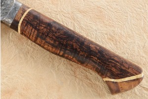 The handle is formed from presentation grade Hawaiian curly koa wood. Box elder burl spacers nicely separate the koa handle from the curly mango front and rear accents. The woods used throughout has been stabilized so that it will hold up well under the rigorous demands of either a home or commercial kitchen. The knife has perfect balance and feels exceptional in the hand!