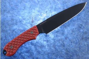 Red G10 handles, which measure 1/2 inch thick, are heavily diamond textured to offer a secure grip without being abrasive. G10 scales are set on a full tang via 416 stainless custom fasteners heat treated to 42 Rc and tumbled.