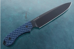 Black and blue G10 handles, which measure 1/2 inch thick, are heavily diamond textured to offer a secure grip without being abrasive. G10 scales are set on a full tang via 416 stainless custom fasteners heat treated to 42 Rc and tumbled.