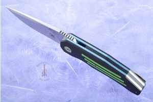 The scales are formed from black G10. Green G10 inlays add exceptional contrast. Jimping on the thumb ramp aids grip. The gently rounded handle feels sturdy and fills out the hand perfectly. The handle is completed with blue anodized titanium liners. The ultra-light black titanium pocket clip is mounted for tip-up carry. This compact version of the A3 is a knife that you'll want to carry!