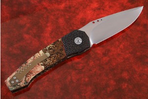 The handle scales combine black lightning strike carbon fiber with presentation grade box elder burl. The wood has tremendous swirling figure. Copper strands move through the carbon fiber weave. This type of carbon fiber was originally designed for use on fighter jets to redirect electricity. Lightning strike carbon fiber is among the hardest to find knifemaking materials. The angular, domed scales are set on blue anodized titanium liners, jewel polished on the interior. An anodized, pierced titanium pocket clip is mounted for tip up carry and makes it easy to keep the knife close at hand. The carbon fiber backbar is inlaid with MoonGlow II (luminescent polyester). This inlay glows in the dark, making the knife easy to find even under dark conditions. A very classy folder, for every day carry, or for that special occasion.