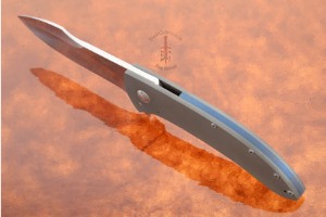 The swayback blade is formed from N690 stainless steel, a super-steel created by Bohler in Austria. It takes an incredibly sharp edge and holds on to it. Increased toughness gives it better resistance to edge chipping. The blade is hollow ground for an easy to maintain edge. By satin finishing the grinds and mirror polishing the flats, George has emphasized his clean grind lines. The blade has silky smooth action -- easily opened with one hand using the ambidextrous flipper toggle. The blade uses the IKBS (Ikoma Korth Bearing System) pivot system. This mechanism, which was originally designed to fit balisong knives, uses ball bearings to create exceptional action with no blade play.