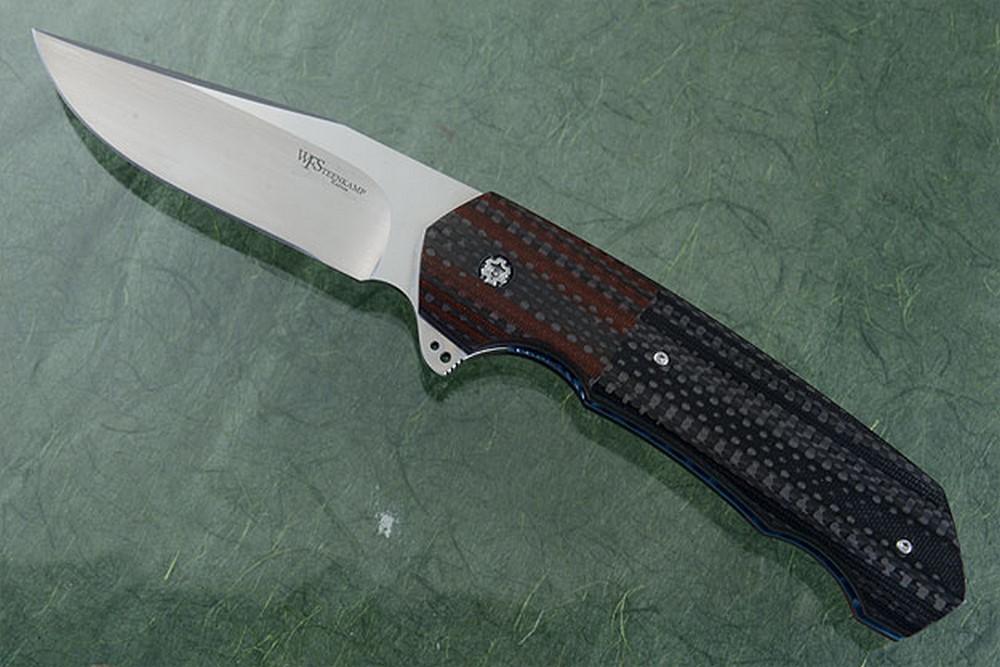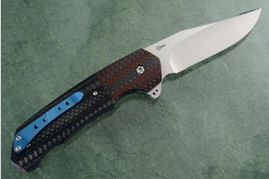 The handle is combines carbon fiber and layered red G10 and carbon fiber. The result is elegant and enticing! Blue anodized titanium liners are jewel polished on the interior. Bothe the backbar and the liners are hand fileworked. A flipper assists in the ease of opening. A ball bearing pivot ensures silky-smooth deployment. The pierced, anodized titanium pocket clip is mounted for tip-up carry.
