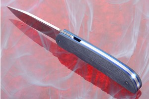 The handle is blue G10 with a nice cutout to make getting to the lockbar easier. Blue anodized titanium liners are jewel polished on the interior. A front flipper assists in the ease of opening. The compact front flipper is easy to use and does not get caught on things while kept in the pocket. The stainless pocket clip is mounted for tip-up carry.