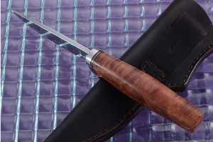 This hunter features a 4.6 inch carbon steel blade hand forged to shape from 52100 carbon steel. Many makers and collectors feel that 52100 is among the best steels available for knifemaking. When combined with a triple temper and triple quench, as shown in the works of Mastersmith Bill Burke, the results are exceptional. A differential heat treatment line is clearly visible on the blade. This shows the division between the soft, supportive spine, and the ultra-hard edge steel. The result: superior edge holding with exceptional durability.