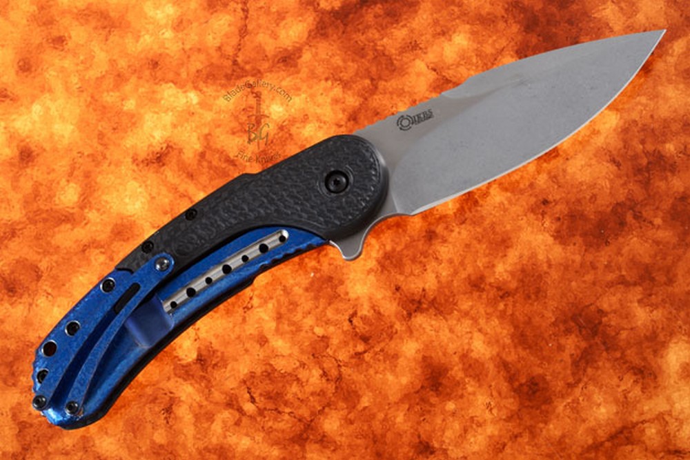 Description: The Bodega is a hallmark of Todd Begg's work. This limed run of 100 knives features a two-tone tumbled finished high hollow blade with satin finished flats. The titanium bolt on lock has been jewel iced and anodized blue accented with a polished silver flute. The pocket clip mirror the lock while the dual color back spacer has checkered jimping for reverse grip control. Carbon fiber scales feature a scalloped pattern for extra grip. All screws are coated black.