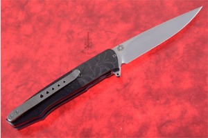The handle combines blue/black carbon fiber with zirconium bolsters that are finely textured and engraved by Andre's wife. The bolsters provide a steadfast grip that is also very beautiful. Zirconium is a new material to the knifemaking world. It is a transitional metal that is primarily mined in South Africa and Australia. Zirconium is highly resistant to corrosion. Jimping on the thumb ramp ensures a secure grip. The gently rounded handle feels sturdy and fills out the hand perfectly. The handle is completed with blue anodized titanium liners and red fiber spacers that elegantly contrast against the carbon fiber scales. The pierced titanium pocket clip is mounted for tip-up carry.