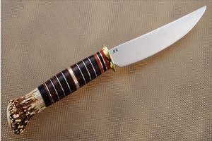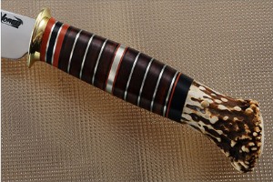 This hunter is very true to Scagel's design -- from the carbon steel upswept blade to the crown stag handle with stacked spacers. Doug chose to follow the color themes used by Scagel, combining leather with bronze, nickel silver, and red and black fiber spacers. The resulting handle is both dramatic and extremely comfortable. The front of the bronze guard has been beveled and fits perfectly to the carbon steel blade. The blade has been meticulously hand satin finished.