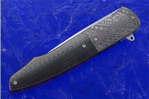 The handle combines carbon fiber with zirconium bolsters that are finely textured and engraved by Andre's wife. The bolsters have an elegant iridescence that is quite captivating. The bolsters provide a steadfast grip that is also very beautiful. Zirconium is a new material to the knifemaking world. It is a transitional metal that is primarily mined in South Africa and Australia. Zirconium is highly resistant to corrosion. Jimping on the thumb ramp ensures a secure grip. The gently rounded handle feels sturdy and fills out the hand perfectly. The handle is completed with blue anodized titanium liners and red fiber spacers. The pierced titanium pocket clip is mounted for tip-up carry.