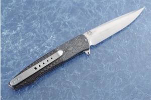 The handle combines black carbon fiber scales with zirconium bolsters that are finely textured and engraved by Andre's wife. The bolsters have an elegant iridescence that is quite captivating. The bolsters provide a steadfast grip that is also very beautiful. Zirconium is a new material to the knifemaking world. It is a transitional metal that is primarily mined in South Africa and Australia. Zirconium is highly resistant to corrosion.