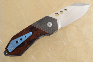 Warm toned desert ironwood scales rest on titanium liners, keeping this knife light and fast. This meets seamlessly with very rare lightning strike carbon fiber bolsters. Copper strands move through the carbon fiber weave. This type of carbon fiber was originally designed for use on fighter jets to redirect electricity. Lightning strike carbon fiber is among the hardest to find knifemaking materials. The color and pattern of the carbon fiber complements the warm toned ironwood. Both the titanium liners and pocket clip are anodized to match. The pierced titanium pocket clip is mounted for tip-up carry. The elongated carbon fiber backbar is inlaid with MoonGlow II (luminescent polyester). This inlay glows in the dark, making the knife easy to find even under dark conditions.
