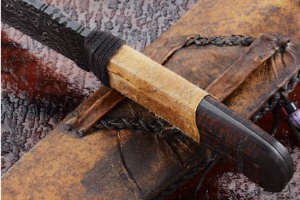 Antiqued maple scales are set on a distal tapered full tang. The scales feature tribal markings. A distal taper to both blade and tang ensures perfect balance.