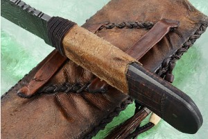 Antiqued maple scales are set on a distal tapered full tang. The scales feature tribal markings. A distal taper to both blade and tang ensures perfect balance.