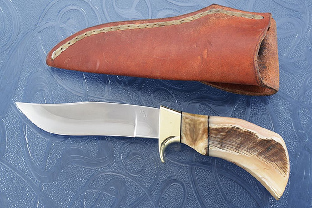 The handle combines sheep horn with a brass guard. The guard protects your fingers from moving onto the blade's edge and brings the weight to the center of the knife. When wet, sheep horn does not become slippery, and it is amazingly durable. A spacer is created by taking two sheep horn end cuts and aligning them outward, producing a very pleasing effect. The knife is accompanied by a sturdy, 14 oz. waxed leather pouch style sheath. An extremely comfortable handle. Excellent fit and finish throughout.