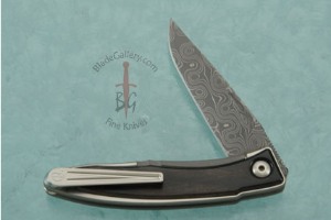 This Mnandi features Gabon ebony with a stainless damascus blade. The wood is inlaid into the frame rather than being simple overlays. The blade is made from Devin Thomas' stainless Raindrop pattern damascus. The steel will have exceptional edge holding and is immediately captivating. Both the liners and pocket clip are formed from 6Al4V titanium, keeping this knife extremely light and durable. The clip is mounted for tip up carry. The knife can be comfortably opened and closed with one hand and locks open for safety. The thumb rest is fileworked for dependable handling. The Mnandi features a strong integral locking mechanism that Chris Reeve popularized.