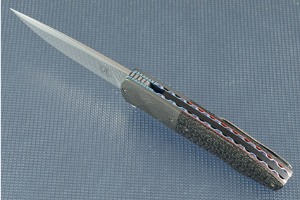 The scales are formed from rare silver strike carbon fiber. This variation of lightning strike carbon fiber uses silver toned wire rather than copper. The scales sit atop red fiber liners, and butt up against engraved zirconium bolsters. Zirconium is similar to some extent to titanium and has tremendous corrosion resistance. The engraved bolsters set off the silver strike carbon fiber perfectly! Hand fileworked, blue anodized titanium liners keep this larger, sturdy knife light and fast. A blue anodized titanium pocket clip is mounted for tip-up carry.