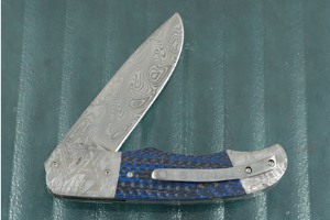The handle combines Gibeon meteorite with blue lightning strike carbon fiber. Copper strands move through the carbon fiber weave. This type of carbon fiber was originally designed for use on fighter jets to redirect electricity. The handle is nicely rounded for a secure, comfortable grip. Titanium liners surround the stainless damascus backbar. A stainless damascus pocket clip makes it easy to keep the knife close at hand.