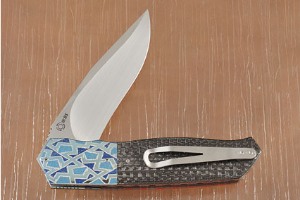 Titanium bolsters are hand engraved, textured, and differentially anodized, ensuring a positive grip. A pierced titanium pocket clip is mounted for right handed tip-up carry. The handle is completed with blue anodized, fileworked titanium liners and red fiber spacers.