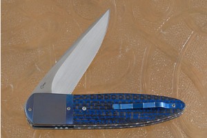 Handle: Very rare black and blue stacked lightning strike carbon fiber
