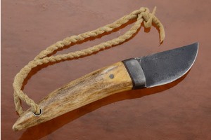 The handle is formed from a hand picked elk tine. An antiqued mild steel guard separates the blade from the handle. A leather spacer assists the handle to adjust to temperature and humidity changes.