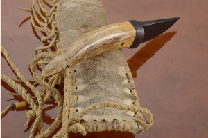 The knife is accompanied by a sheath by Karen Shook. The frontier style neck sheath is formed from rawhide with fringe decorated with trade beads. The neck sheath nicely complements Daniel's work on the knife.