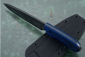 Black and blue G10 handles, which measure 1/2 inch thick, are heavily diamond textured to offer a secure grip without being abrasive. G10 scales are set on a full tang via 416 stainless custom fasteners heat treated to 42 Rc and tumbled.