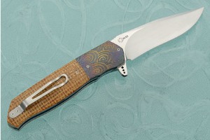 Zirconium bolsters have been textured, engraved, and differentially anodized, providing a steadfast grip that is also very beautiful. Zirconium is a new material to the knifemaking world. It is a transitional metal that is primarily mined in South Africa and Australia. Zirconium is highly resistant to corrosion. Titanium liners have been hand fileworked and differentially anodized with light blue flats and purple inside the bevels. The machined titanium pocket clip is mounted for tip-up carry.