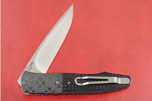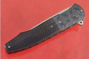 The handle material is blue/silver carbon fiber. Zirconium bolsters are hand textured, providing a steadfast grip that is also very beautiful. Zirconium is a new material to the knifemaking world. It is a transitional metal that is primarily mined in South Africa and Australia. Zirconium is highly resistant to scratching and corrosion.