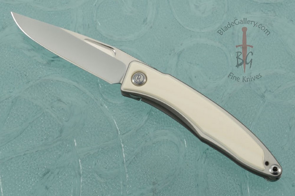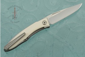 This Mnandi features ancient wooly mammoth ivory scales. The scales are inlaid into the frame rather than being simple overlays. The blade is made from S35VN stainless steel for strength and keen edge retention. Both the liners and pocket clip are formed from 6Al4V titanium, keeping this knife extremely light and durable. The clip is mounted for tip up carry. The knife can be comfortably opened and closed with one hand and locks open for safety. The thumb rest is fileworked for dependable handling. The Mnandi features a strong integral locking mechanism that Chris Reeve popularized.