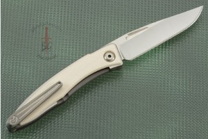 This Mnandi features ancient wooly mammoth ivory scales. The scales are inlaid into the frame rather than being simple overlays. This presentation grade mammoth ivory is from the interior of the tusk and combines cream and burnt milk tones. The blade is made from S35VN steel for strength and keen edge retention. Both the frame and pocket clip are formed from 6Al4V titanium, keeping this knife extremely light and durable. The clip is mounted for tip up carry. The knife can be comfortably opened and closed with one hand and locks open for safety. The thumb rest is fileworked for dependable handling. The Mnandi features a strong integral locking mechanism that Chris Reeve popularized.