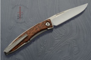 This Mnandi features premium snakewood scales. The scales are inlaid into the frame rather than being simple overlays. The blade is made from Crucible S35VN steel, hardened to 58-59 Rc for strength and keen edge retention. Both the frame and pocket clip are formed from 6Al4V titanium, keeping this knife extremely light and durable. The clip is mounted for tip up carry. The knife can be comfortably opened and closed with one hand and locks open for safety. The thumb rest is fileworked for dependable handling. The Mnandi features a strong integral locking mechanism that Chris Reeve popularized.