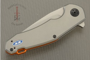 The titanium handle has a sturdy frame lock and a bead blasted finish. The contrasting combination of the stonewash finished blade and bead blasted handle makes the ZT 0220 exceptionally handsome. To enhance the 0220’s custom look and feel, Jens added a decorative pivot as well as a ZT logo medallion near the butt of the knife. The aluminum backspacer is anodized in an eye-catching orange and has a built-in lanyard attachment for added utility.