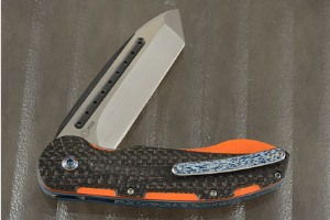 The handle is formed from contoured lightning strike carbon fiber set on orange G10 spacers. This type of carbon fiber was originally designed for use on fighter jets to redirect electricity. Lightning strike carbon fiber is among the hardest to find knifemaking materials. Blue anodized titanium liners keep the knife incredibly light. The titanium backbar has been anodized and textured. The titanium pocket clip is textured and anodized. It is mounted for right-handed tip-up, deep pocket carry.