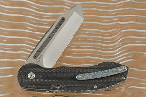 The handle is formed from contoured carbon fiber set on anodized titanium liners keeping the knife incredibly light. The backbar has been differentially anodized and textured. The liners are hand fileworked. The pocket clip is textured and anodized to match the backbar. It is mounted for right-handed tip-up, deep pocket carry.
