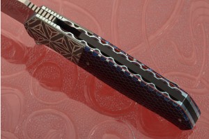 The handle combines blue C-Tek with zirconium bolsters that are finely textured and engraved by Andre's wife. The bolsters have an elegant iridescence that is quite captivating. The bolsters provide a steadfast grip that is also very beautiful. Zirconium is a new material to the knifemaking world. It is a transitional metal that is primarily mined in South Africa and Australia. Zirconium is highly resistant to corrosion.