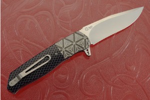Jimping on the thumb ramp ensures a secure grip. The gently rounded handle feels sturdy and fills out the hand perfectly. The handle is completed with blue anodized titanium liners and red fiber spacers. The titanium pocket clip is mounted for tip-up carry.