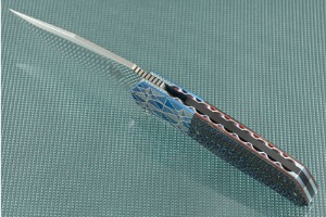 The scales are blue/silver carbon fiber. Jimping on the thumb ramp provides a comfortable, secure grip. The gently rounded handle feels sturdy and fills out the hand perfectly. Engraved, differentially anodized titanium bolsters provide a steadfast grip that is also very beautiful. Titanium liners sit against red fiber spacers and have been fileworked and anodized. A black G10 backspacer helps keep the knife light. The pierced titanium pocket clip is mounted for right-handed, tip-up carry.