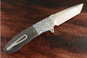 The scales are silver strike carbon fiber that have been nicely domed and polished. This variation of lightning strike carbon fiber uses aluminum wire (rather than copper) woven through the carbon strands. Jimping on the thumb ramp provides a comfortable, secure grip. The gently rounded handle feels sturdy and fills out the hand perfectly. The engraved, differentially anodized titanium bolsters provide a steadfast grip that is also very beautiful. Titanium liners rest against red fiber spacers and have been fileworked and anodized. A black carbon fiber backspacer helps keep the knife light, yet strong. The pierced titanium pocket clip is mounted for tip-up carry.