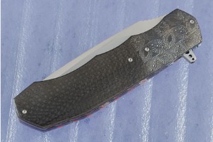 The scales are formed from carbon fiber. Jimping on the thumb ramp provides a comfortable, secure grip. The gently rounded handle feels sturdy and fills out the hand perfectly. Zirconium bolsters have an elegant iridescence that is quite captivating. Zirconium is a new material to the knifemaking world. It is a transitional metal that is primarily mined in South Africa and Australia. Zirconium is highly resistant to corrosion and scuffing. The handle is completed with blue anodized titanium liners and red fiber spacers. The pierced titanium pocket clip is mounted for right-handed, tip-up carry.