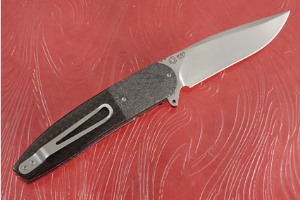 The scales are carbon fiber that has been nicely domed and polished. Jimping on the thumb ramp provides a comfortable, secure grip. The gently rounded handle feels sturdy and fills out the hand perfectly. The monotoned, engraved, anodized zirconium bolsters provide a steadfast grip that is also very beautiful. Zirconium is a new material to the knifemaking world. It is a transitional metal that is primarily mined in South Africa and Australia. Zirconium is highly resistant to corrosion and scratching. Titanium liners rest against red fiber spacers and have been fileworked and anodized. A black G10 backspacer helps keep the knife light, yet strong. The pierced titanium pocket clip is mounted for tip-up carry.