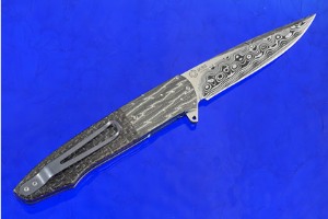 The scales are silver strike carbon fiber that have been nicely domed and polished. This variation of lightning strike carbon fiber uses aluminum wire (rather than copper) woven through the carbon strands. Jimping on the thumb ramp provides a comfortable, secure grip. The gently rounded handle feels sturdy and fills out the hand perfectly. The engraved, anodized zirconium bolsters provide a steadfast grip that is also very beautiful. Zirconium is a new material to the knifemaking world. It is a transitional metal that is primarily mined in South Africa and Australia. Zirconium is highly resistant to corrosion. Titanium liners rest against red fiber spacers and have been fileworked and anodized. A black G10 backspacer helps keep the knife light, yet strong. The machined TiAlN (titanium aluminum nitride) pocket clip is mounted for tip-up carry.