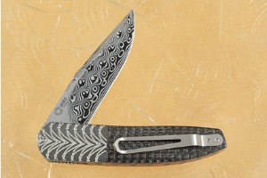 L28M Flipper with Damascus, Silver Strike Carbon Fiber and Engraved Zirconium (Ceramic IKBS)