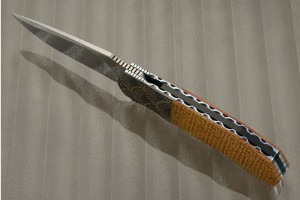 The scales are Thunderstorm Kevlar that has been nicely domed and polished. This rare and exciting variation on lightning strike carbon fiber combines brass wire woven into Kevlar strands. Jimping on the thumb ramp ensures a secure purchase. The flipper allows for silky-smooth and fast blade deployment.