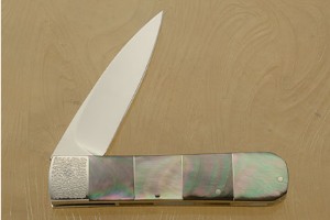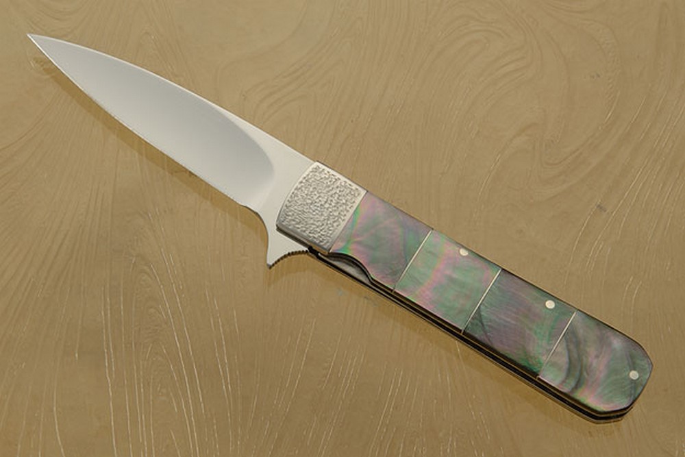 Sections of blacklip mother of pearl have been set to resemble the shape of bamboo. Stainless spacers separate each of the "bamboo" sections. The dark toned pearl has tremendous underlying texture and flash. A 316 stainless steel bolster is hammer textured. The 316 stainless steel backbar is inlaid with four sections of mother of pearl.