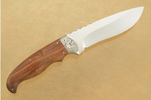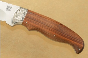 South African tamboti wood (Spirostachys africana)scales are set on a distal tapered full tang. The stainless steel bolster is nicely dovetailed to the tamboti scales, ensuring a perfect fit. The hand engraved bolster shows a lion footprint. The handle is nicely carved to swell in the middle and end for a perfect grip. This is a knife you won't want to put down.